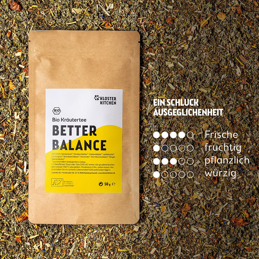 Better Balance es una infusión ecológica elaborada con hierbas ecológicas cuidadosamente seleccionadas y cortadas en trozos grandes. No está aromatizada y destaca por su aroma herbal naturalmente suave y equilibrado, ideal para disfrutar conscientemente en el día a día.