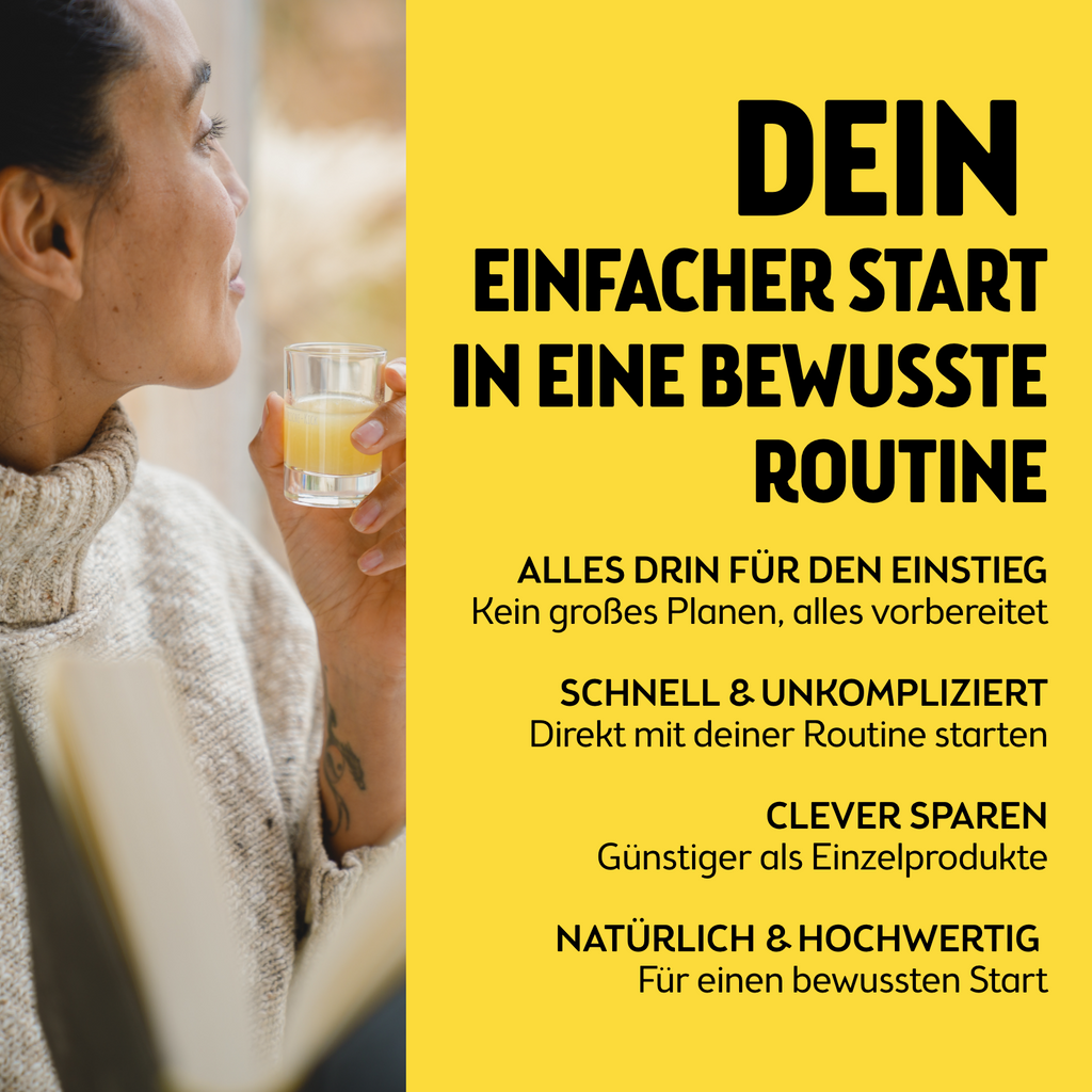 Empiece su rutina consciente sin pensárselo: el set de inicio contiene todo lo que necesita para el uso diario. Cada producto se complementa perfectamente con los demás para que sienta el efecto completo desde el principio. La cantidad incluida es suficiente para unos 31 días, por lo que podrá incorporar fácilmente la rutina a su vida diaria. Perfecto para cualquiera que desee empezar a mejorar sus hábitos de forma consciente: rápido, sencillo y combinado de forma inteligente.
