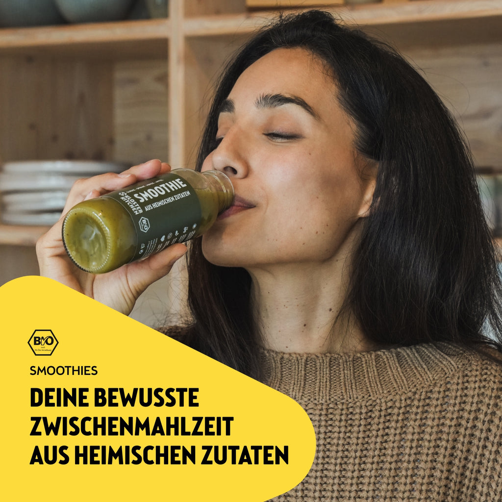 Nuestros smoothies están elaborados con ingredientes naturales - sin azúcares añadidos, ecológicos, veganos y envasados en botellas de vidrio. Perfectos como tentempié rápido y saludable entre comidas o como tentempié refrescante sobre la marcha. La combinación de manzanas locales, zanahorias, ruibarbo, fresas, peras, espinacas, menta y pepino garantiza una experiencia de sabor armoniosa. Ideal para quienes valoran una dieta sana y no quieren renunciar al sabor.