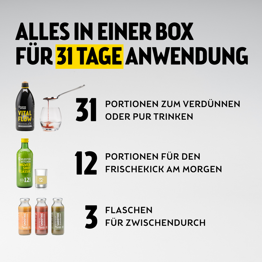 85 % de zumo de fruta concentrado (31 % uva, pera, manzana, 9,4 % frambuesa, lima, aronia, piña, membrillo, naranja, grosella negra, limón, fruta de la pasión, granada, mora, arándano, saúco, guinda, plátano, arándano rojo, ciruela, mandarina, endrina, albaricoque, melocotón, arándano rojo, mirabel, grosella, pomelo, rosa mosqueta, melón, espino amarillo, fresa), sirope de ágave, 2,2 % de zumos vegetales concentrados (1,2 % de remolacha, 0,6 % de zanahoria negra, tomate, pepino, brécol, cebolla), 1,7 % de zumo concentrado de pataca lactofermentada, 1,3 % de extracto de avena fermentada (copos de avena integrales sin gluten, agua), carbonato de magnesio, 0,5 % de zumo de jengibre, vitamina C, pulpa de mango, concentrado de frutas y hortalizas (boniato, manzana, cereza, rábano), manzana, cereza, rábano), 0,6 % de extractos vegetales (flor de saúco, ginseng, acerola, té verde), puré de verduras (calabaza, pimentón), niacina, vitamina E, bisglicinato de hierro(II), sulfato de cinc, zumo de cúrcuma, 0,03 % de extracto de hierbas y especias (raíz de regaliz, hojas de estramonio, hojas de zarzamora, hojas de menta, flores de manzanilla, flor de saúco, musgo de Islandia, flor de tilo, flor de malva, hojas de salvia, flor de primavera, anís estrellado, hierba de tomillo, hojas de eucalipto, hinojo, flor de aciano, hojas de malvavisco, flor de caléndula, flor de milenrama, flor de lana), ácido pantoténico, vitamina B6, vitamina B2, vitamina B1, ácido fólico, biotina, cloruro de cromo(III) hexahidratado, vitamina D3, vitamina B12.